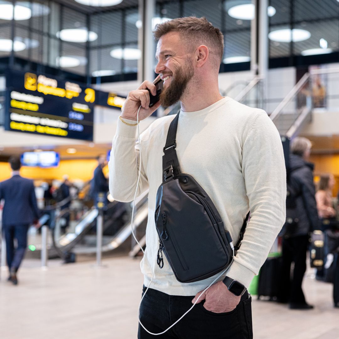 Kompakt, vandtæt og stilfuld – den perfekte makker til både hverdags og rejseeventyr. Premium materiale. Udvendig USB til opladning af smartphone. Justerbar og komfortabel rem.